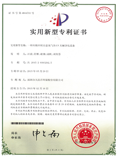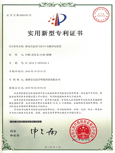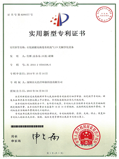 煙氣及工業(yè)化合物氣體光解凈化裝置專(zhuān)利證書(shū)